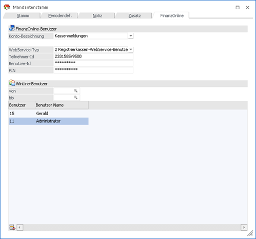 In der WinLine-Benutzer-Tabelle sind jene WinLine Benutzer zu hinterlegen, welche dem oben angegebenen FinanzOnline-Benutzer zugeordnet sind bzw. entsprechen. Bei der Übermittlung von Finanzamt-Meldungen über WebService werden die Zugangsdaten des oben angegebenen FinanzOnline-Benutzers für den angemeldeten WinLine-Benutzer herangezogen.