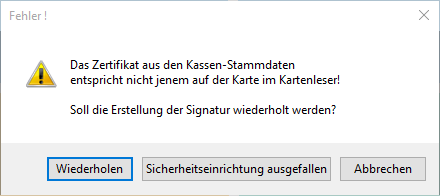 Wenn Wiederholen gedrückt wird, wird versucht die Signatur nochmals zu Erzeugen. Falls es möglich sein sollte die Signatur zu erstellen, verschwindet dieses Fenster und der Beleg bzw. die Zahlung wird abgeschlossen. Andernfalls erscheint die Meldung wieder.
