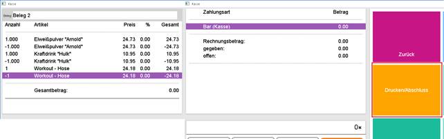 Wenn die Vorschau bereits gedruckt wurde können die Artikelzeilen nur noch mit Minusmengen storniert werden und nicht komplett entfernt werden. Um diesen Beleg abzuschließen/entfernen muss der Beleg als 0 Rechnung abgeschlossen werden.
