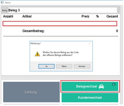 Wenn noch keine Vorschau gedruckt wurde, kann per Button Zeilenstorno alle Zeilen storniert werden. Wenn dann mit diesem leeren Beleg der Button Belegwechsel gedrückt wird, kann entschieden werden, ob dieser gelöscht werden soll oder als leerer Beleg wieder geparkt werden soll bzw. immer gelöscht werden soll, ohne das noch einmal danach gefragt werden soll.