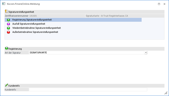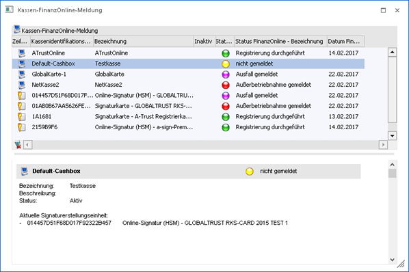 Unter dieser Tabelle ist ein Bereich ersichtlich, der zur markierten Kasse bzw. Signatur einige Informationen liefert lt. Kassen-Stammdaten liefert.
