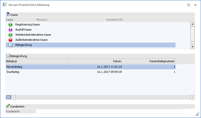 Sofern bei einer Kasse bereits ein Startbeleg erzeugt wurde, kann bei der Kasse auch die Funktion "Belegprüfung" ausgewählt werden.