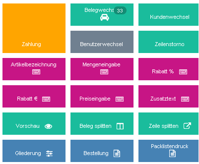 Auf der rechten Seite befinden sich die zuvor erfassen Artikel des Tableaus in Form von Kacheln. Zusätzlich gibt es rechts oben ein Suchfeld für eine Artikel-Suche und einen + und - Button für Vergrößerung oder Verkleinerung der Schrift der einzelnen Kacheln.
