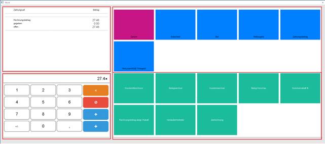 Auch das Zahlungsdashboard ist in drei Abschnitte aufgeteilt. Links oben befindet sich ein interaktiver Kassenbon wo die Gesamtsumme und die gewählten Zahlungsarten angezeigt werden. Links unten befindet sich ein Nummernpad, welches zur Eingabe von Zahlen verwendet wird. Im rechten Abschnitt des Zahlungsdashboards werden in der oberen Hälfte die im Zahlungstableau hinterlegten Zahlungsarten angezeigt und in der unteren Hälfte die Zahlungsbuttons.