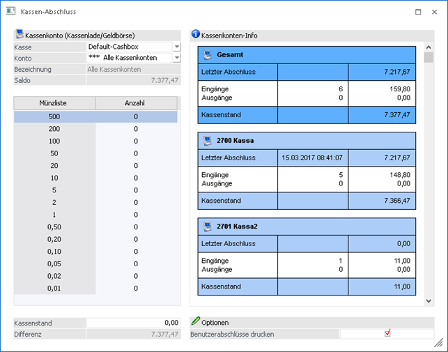 Ist der Eintrag "alle Kassenkonten" ausgewählt wird oben eine Summe über alle Kassenkonten angezeigt und darunter die einzelnen Konten-Summen.