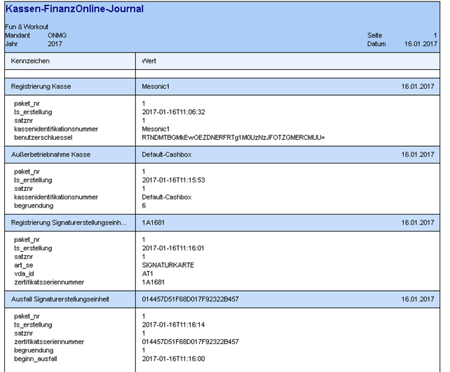 Die verschiedenen bereits durchgeführten Meldungen sind anschließend im Hauptfenster "Kassen-FinanzOnline-Meldung" ersichtlich und können zusätzlich mit dem Ribbon-Button "Kassen-FinanzOnline-Journal" als Bildschirmausgabe oder direkt am Drucker ausgegeben werden.