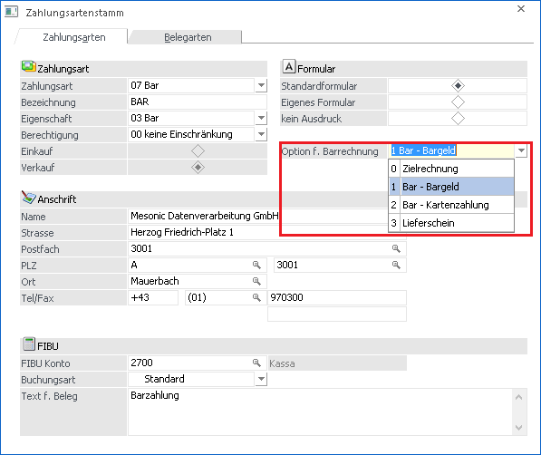 Im Fenster Zahlungsarten gibt es die Auswahllistbox "Option f. Barrechnungen" wo ausgewählt werden kann, ob diese Zahlungsart als Zielrechnung, Bargeld-, oder Kartenzahlung verwendet werden soll.