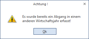 Wenn bereits in einem anderen Jahr ein Abgang für das ausgewählte Anlagegut eingetragen wurde, kommt eine entsprechende Fehlermeldung. Abgänge können nur im aktuellen Wirtschaftsjahr editiert werden.