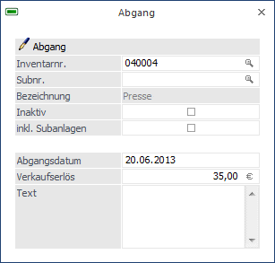 Um einen Abgang eines Anlagegutes zu berücksichtigen, wählen Sie den Menüpunkt