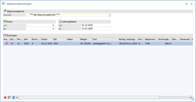 Die Faktura wird im Dezember 2025 auf ein bereits definiertes Abgrenzungskonto (Sachkontenstamm - Feld 'Abgrenzungskonto') gebucht (Aufwand an Kreditor). Im Buchungsfenster gibt es den Button 'Abgrenzungsbuchungen erstellen'. Beim Drücken des Buttons wird ein neues Fenster geöffnet, wo man die abzugrenzenden Buchungen auf ein bereits definiertes Abgrenzungskonto erzeugen kann.