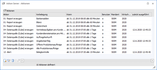In der Tabelle werden alle definierten Aktionen mit den wichtigsten Informationen (Aktionstyp, Vorbelegung, Benutzer, Mandant, Jahr) dargestellt. Zusätzlich wird auch angezeigt, wann der Action Server-Eintrag zuletzt gestartet worden ist. Ist eine Aktion bereits beendet (erledigt), wird durch den Hinweis "Aktion beendet!" darauf hingewiesen.