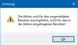 Wenn sich der aktuell eingeloggte Benutzer von jenem der Aktion unterscheidet, so wird die Aktion im Kontext des eingeloggten Benutzers durchgeführt. Hierauf wird durch folgende Meldung hingewiesen:
