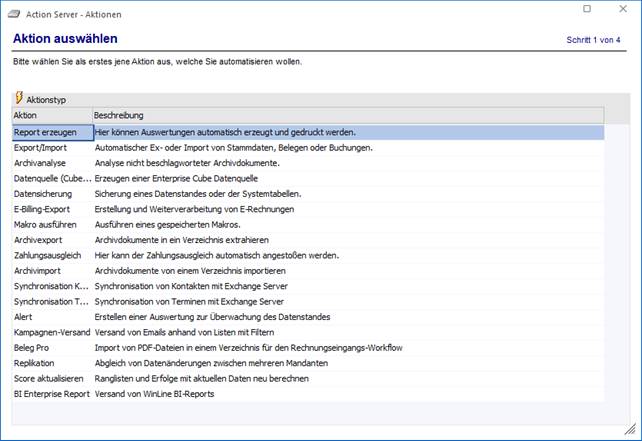 Im ersten Schritt des Assistenten kann eine der zur Verfügung stehenden Aktionen ausgewählt werden.
