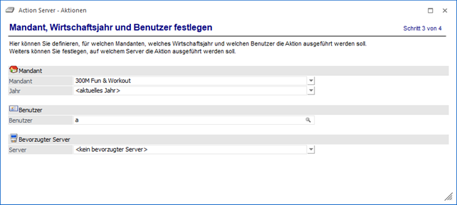 Im dritten Schritt wird festgelegt, in welchem Mandanten bzw. welchem Wirtschaftsjahr die Aktion ausgeführt werden soll.