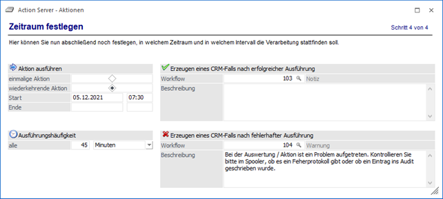 Im vierten und letzten Schritt des Assistenten kann festgelegt werden, ob es sich um eine einmalige oder eine wiederkehrende Aktion handelt.