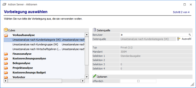 Aus der linken Tabelle, in welcher alle angelegten Cube-Definitionen mit vorhandenen Objektberechtigungen angezeigt werden, kann der gewünschte Cube ausgewählt werden. Da das Datenmaterial für eine Cube-Ausgabe immer aus einer Datenquelle stammt, steht im rechten Bereich des Fensters eine entsprechende Auswahl zur Verfügung.
