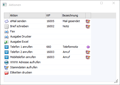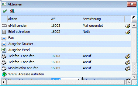 Im Feld "WF" kann der auszuführende CRM-Schritt (Aktionschritt bzw. der Startschritt eines Workflows) hinterlegt werden. Durch Drücken der F9-Taste kann nach Aktionen bzw. Startpunkten gesucht werden.
