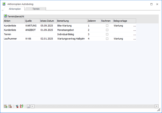 Über die Tabelle des Registers "Aktionsplan" erfolgt die Anzeige aller bereits definierten Termin dargestellt. Diese können überarbeitet oder neue Termine erfasst werden.