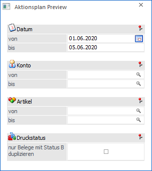 Durch Anwahl des Buttons "Vorschau" im Fenster Kalendereintrag wird das Fenster "Aktionsplan Preview" geöffnet. Mit Hilfe dieser Preview kann eine Vorschau jener Belege ausgegeben werden, die bei dem (zuvor gewählten) Termin erzeugt werden würden.