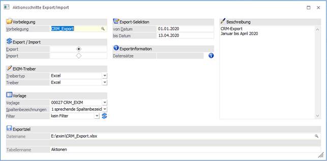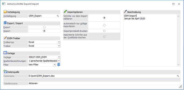 In diesem Menüpunkt können CRM-Einträge (Aktionsschritte oder Workflows) exportiert sowie importiert werden.