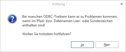 Je nachdem, welche ODBC-Treiber verwendet werden, bzw. welche ODBC-Treiber-Version verwendet wird, kann es zu ungewünschten Verhalten des Export/Imports kommen, wenn Sonderzeichen im Ziel- Verzeichnisnamen oder im Datenbanknamen vorkommen. Aus diesem Grund wird - wenn solche Sonderzeichen verwendet werden - eine entsprechende Warnmeldung ausgegeben: