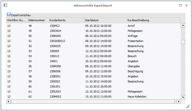 Nach Drücken des Buttons "Exportvorschau" werden sämtliche Datensätze, die nach Starten des Exports durch Drücken der Taste "OK" exportiert würden, in einer Tabelle am Bildschirm angezeigt.