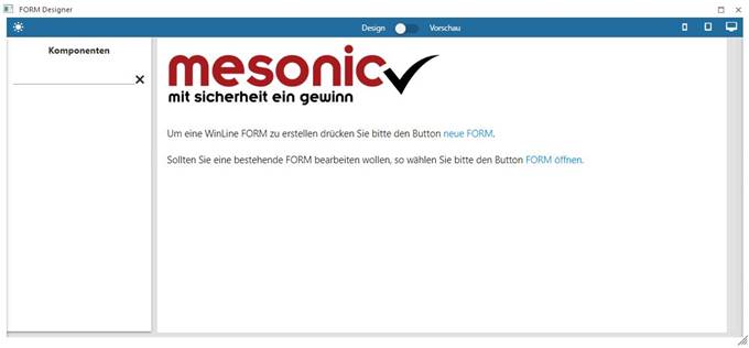Beim Start des FORM Designer kann im Startbildschirm über den Button "neue FORM", sowie den Button "FORM öffnen" oder den Link im Eröffnungstext begonnen werden.