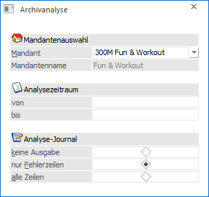 An dieser Stelle wird aus der Auswahlliste der gewünschte Mandant gewählt, für dessen Archiveinträge eine Analyse erfolgen soll. Dadurch wird in der nächsten Zeile der Mandantenname angezeigt.