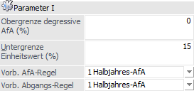 Wird keine Obergrenze degressive AfA (%) eingetragen, erfolgt kein Vorschlag im Anlagenstamm und auch keine Prüfung der Obergrenze.
