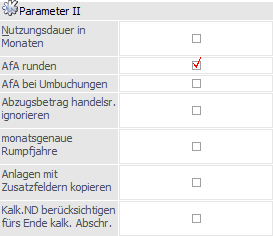 Die Checkbox kann pro Wirtschaftsjahr aktiviert bzw. deaktiviert werden. Wenn der Abzugsbetrag z.B. ab 2010 handelsrechtlich nicht mehr berücksichtigt werden darf, dann in allen Wirtschaftsjahren ab 2010 die Checkbox im Anlagenparameter aktivieren.