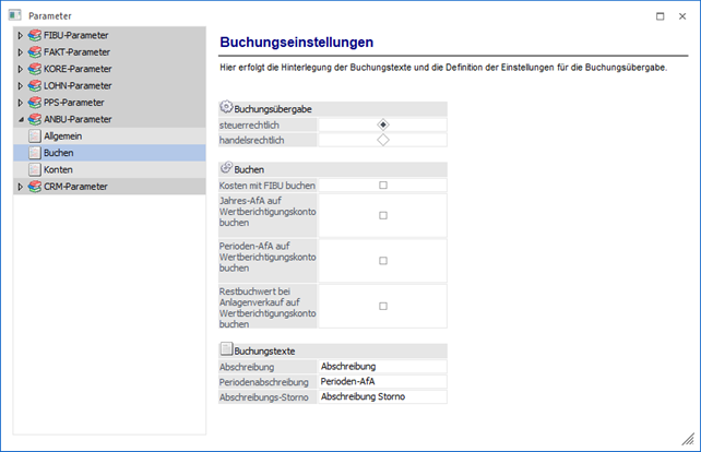 Über den Bereich "ANBU-Parameter - Buchen" können die u.a. Einstellungen für die Buchungsübergabe definiert werden.