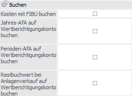Durch Aktivieren bzw. Deaktivieren der Checkbox kann bestimmt werden, ob die buchmäßigen Abschreibungswerte für die Kostenrechnung in den FIBU-Stapel mit übergeben werden oder nicht. Ist dieses Feld aktiv, dann ist keine kalkulatorische Abschreibung möglich.