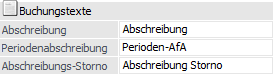 Der hier hinterlegte Text wird bei der Periodenabschreibung als Buchungstext in den FIBU-Buchungsstapel übernommen. Voreingestellt ist der Buchungstext "Perioden-AfA".