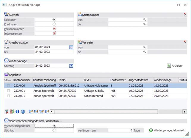 Die Wiedervorlage der Angebote/Anfragen kann jederzeit und beliebig oft abgerufen werden. Die Wiedervorlage der Belege erfolgt im Menüpunkt…
