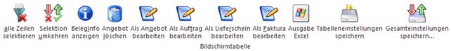 Durch Anwählen einer der vier Buttons wird der aktivierte Beleg in der Belegerfassung geöffnet. Dementsprechend, welcher Button gewählt wurde, wird der Beleg in der ausgewählten Belegstufe zur Bearbeitung vorgeschlagen. Bei den Buttons handelt es sich um die Belegstufen in folgender Reihenfolge: Angebot, Auftrag, Lieferschein, Faktura.