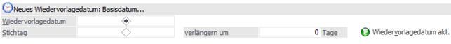 Durch Anwählen dieses Buttons wird der Wiedervorlagezeitraum für die selektierten Belege um X Tage verändert. Damit der Zeitraum verlängert wird, müssen die Tage im dafür vorgesehenen Eingabefeld eingetragen werden. Dabei kann entschieden werden, ob sich das neue Wiedervorlagedatum anhand des Stichtages oder anhand des alten Wiedervorlagedatums errechnet.