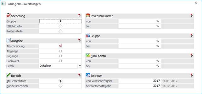 Hier kann entschieden werden, ob die Wirtschaftsgüter nach ihrer Anlagengruppe, dem FIBU-Konto oder der Kostenstelle gruppiert und summiert werden sollen.