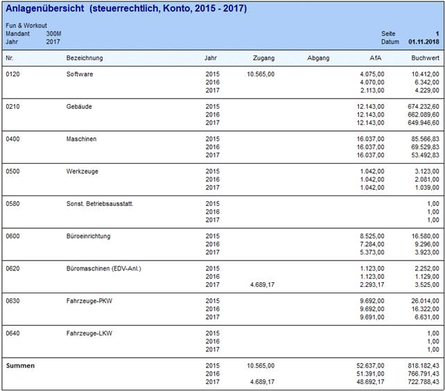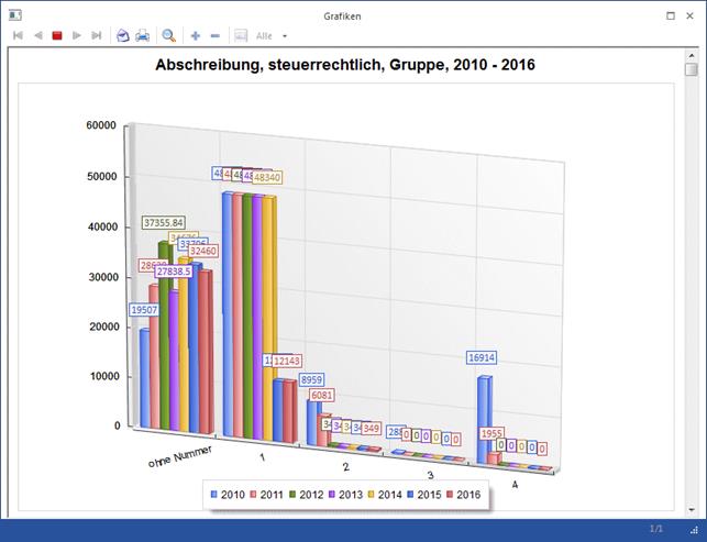 Mit den Anlagenauswertungen können Sie eine jahresübergreifende graphische Auswertung und eine Anlagenübersicht Ihrer Anlagegüter ausgeben.