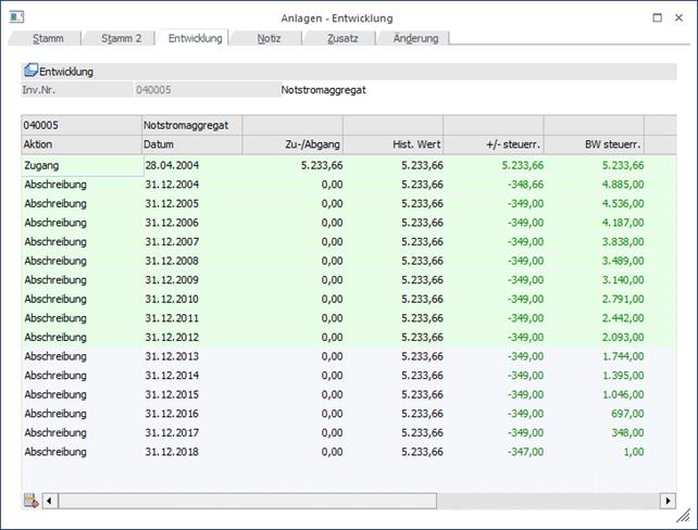 Im Fenster "Entwicklung" ist jederzeit die komplette Historie der aktuell aufgerufenen Anlage ersichtlich. Tatsächlich bedeutet das, dass in den Anlagenstamm nicht nur ein bestimmter Zeitpunkt X abgespeichert ist und nur einen gewissen Blick auf einen ganz konkreten Zeitpunkt im Leben der Anlage zulässt, sondern dass jederzeit jeder beliebige Zeitpunkt der gesamten Nutzungsdauer eingesehen werden kann (wann hatte oder wird die Anlage welchen Buchwert haben, usw.).