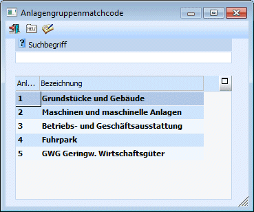 Durch Drücken der RETURN-Taste werden alle angelegten Anlagengruppen angezeigt. Durch einen Doppelklick auf den gewünschten Eintrag kann die Anlagengruppe in das Eingabefeld übernommen werden.