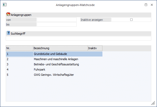 Durch Anklicken kann die Anlagengruppe, die in der Matchcode-Tabelle aktiviert wurde, editiert werden.