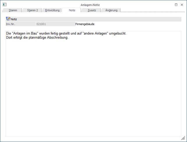 Im Bildschirmbereich Notiz können zusätzliche Informationen, die das Anlagegut betreffen, in Form eines Notizblockes (Unformatierter Fließtext) hinterlegt werden.