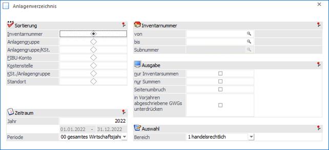 Hier kann entschieden werden, ob im Anlagenverzeichnis die steuerrechtlichen oder handelsrechtlichen Werte ausgegeben werden sollen.