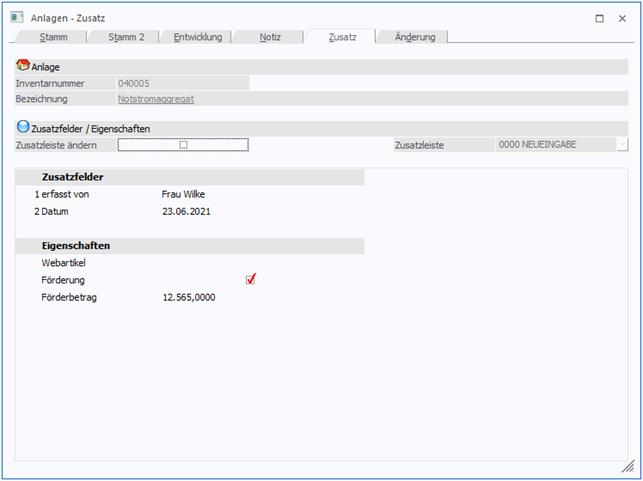 Die Eingabe der Daten pro Anlage erfolgt im Menüpunkt Stammdaten/Anlagenstamm im Register ZUSATZ.