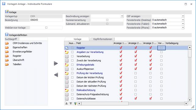In der Vorlage müssen all jene Felder hinzugefügt werden, die in einem Buch zur Verfügung stehen sollen. Es kann aus allen CRM Feldern (inkl. Zusatzfeldern), Eigenschaften und Erweiterungsfeldern gewählt werden.