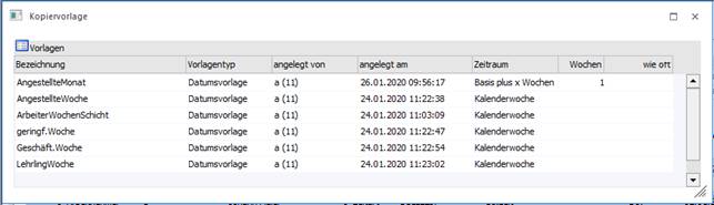 Beim Druck auf diesen Button wird ein eigens Fenster geöffnet, in dem bereits alle gespeicherten Vorlagen angezeigt werden. Es kann nun eine neue Vorlage angelegt oder eine bestehende überschrieben werden. Damit können Sollzeiten als wiederkehrender Dienstplan verwendet werden.
