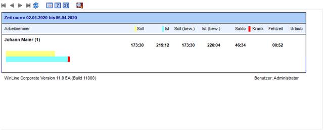 Wenn der Button aktiviert ist, wird für alle in der Tabellenansicht vorhanden Arbeitnehmer bzw. Mitarbeiter eine Gesamtsumme für Ist, Soll, Fehlzeit und Urlaub angezeigt. Das OIF wird beim Entfernen von Zeilen, beim Kopieren auf einen anderen Zeitraum, beim Editieren und beim Verschieben von Zeilen bzw. Einträgen im Kalender aktualisiert. Der Button wird benutzerspezifisch gespeichert.