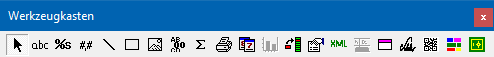 Der Werkzeugkasten stellt verschiedene Elemente bereit, welche auf dem Formular abgelegt werden können. Um ein Element, z.B. eine Variable zu platzieren, muss das entsprechende Symbol aus der Toolbox ausgewählt und dann mit einem Mausklick auf dem Formular abgelegt werden. Danach öffnet sich ein weiteres Fenster, in dem Parameter bestimmt und Formatierungen zugewiesen werden können. Eine genaue Erläuterung der Elemente finden Sie in dem Kapitel "Die Buttonleisten" bzw. "Buttons und Funktionen im Detail".