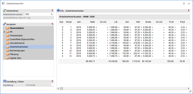 In dem Bereich "Arbeitnehmerkosten" werden die Arbeitnehmerkosten des Arbeitnehmers angezeigt, wobei nur die Monate berücksichtigt werden, für welche es auch Abrechnungen gibt.