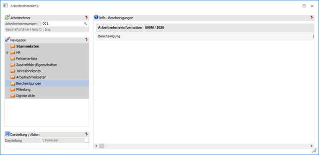 Wenn der WinLine LOHN Deutschland in Verwendung ist, so steht der Bereich "Bescheinigungen zur Verfügung. Hier werden alle Bescheinigungen angezeigt, die für den AN bereits erstellt wurden.